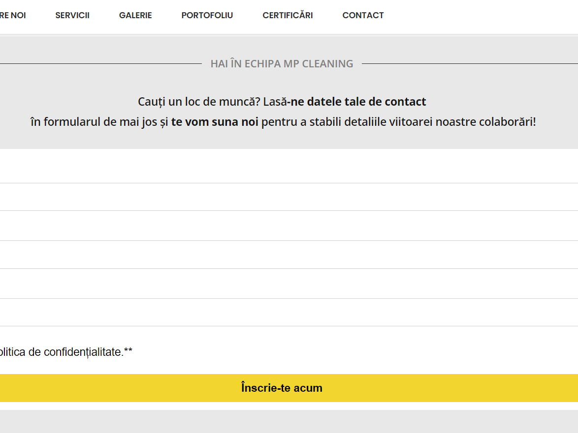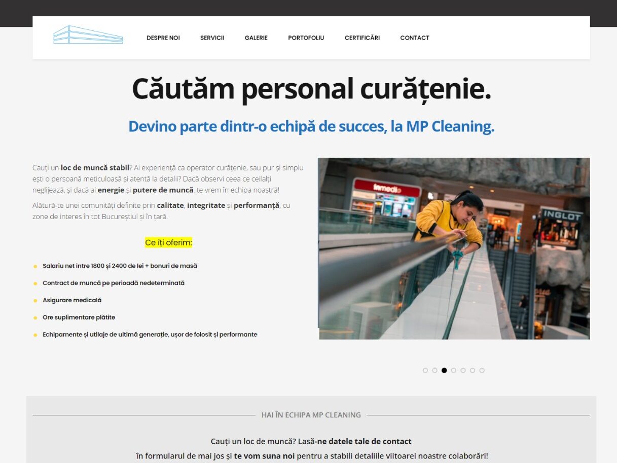 Unul dintre cei mai noi clienți Digital Heart, MP Cleaning, beneficiază de pachetul complet de promovare plătită (Facebook Ads, Instagram Ads, Google Ads) pentru a recruta noi angajați în cadrul companiei. De asemenea, Digital Heart gestionează ramura de comunicare online eficientă cu potențialii candidați prin contact permanent cu aceștia.